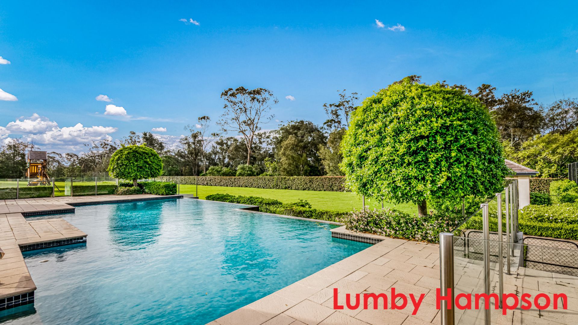Full sized tennis court, manicured hedges, vast lawns