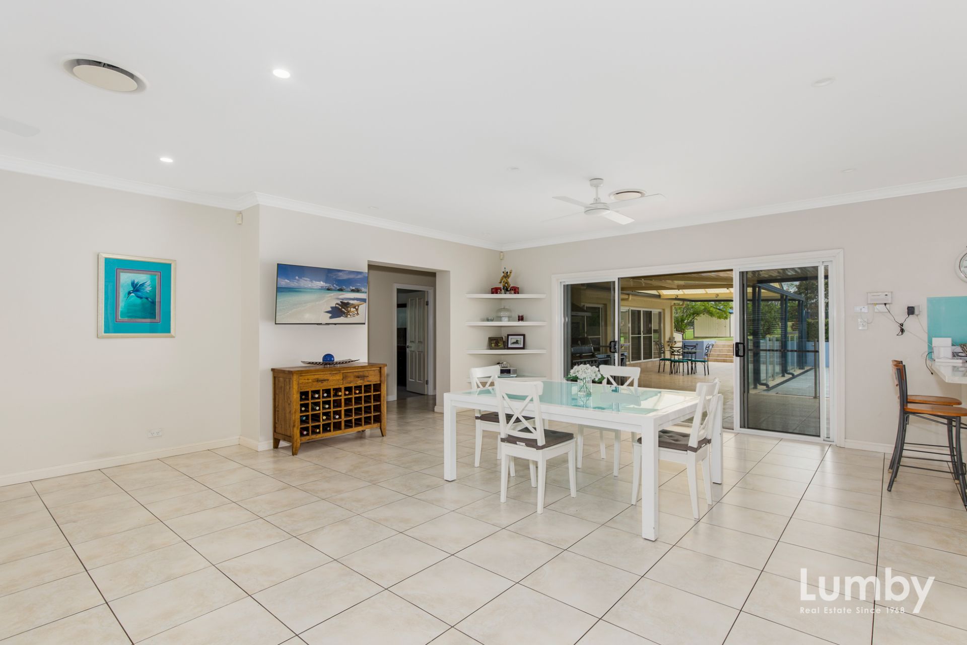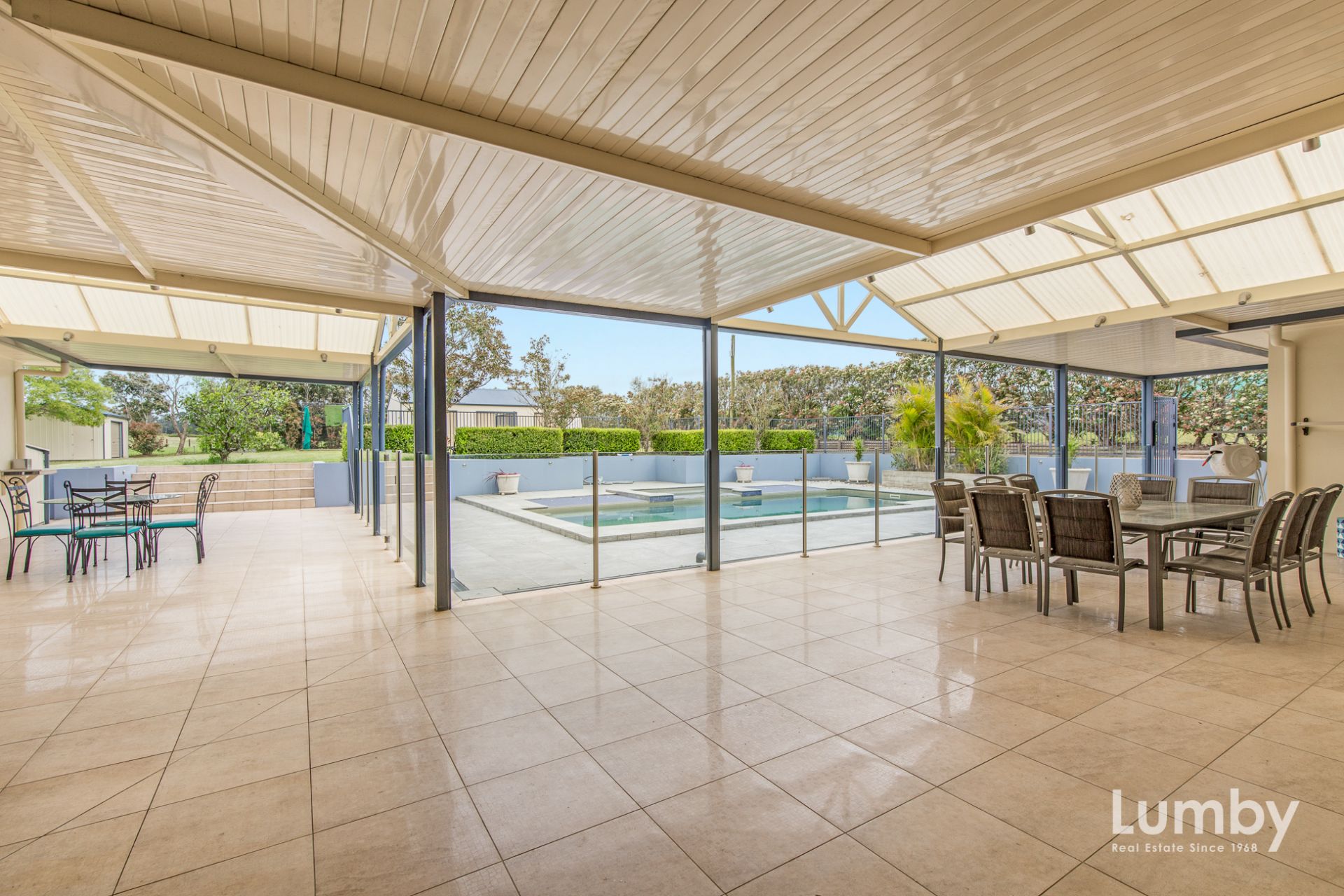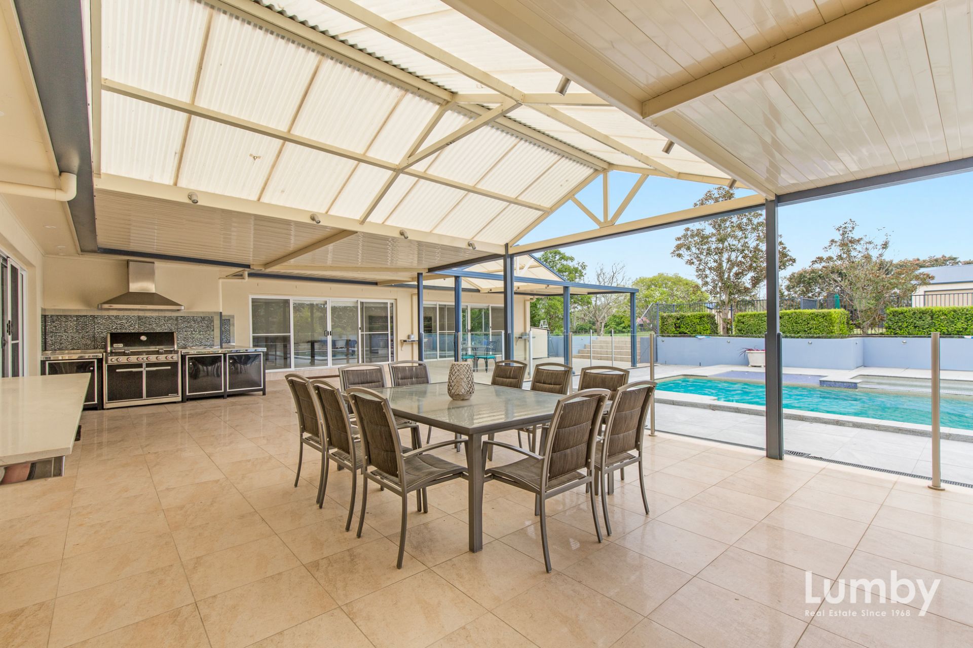 Expansive covered outdoor entertaining area with built-in BBQ